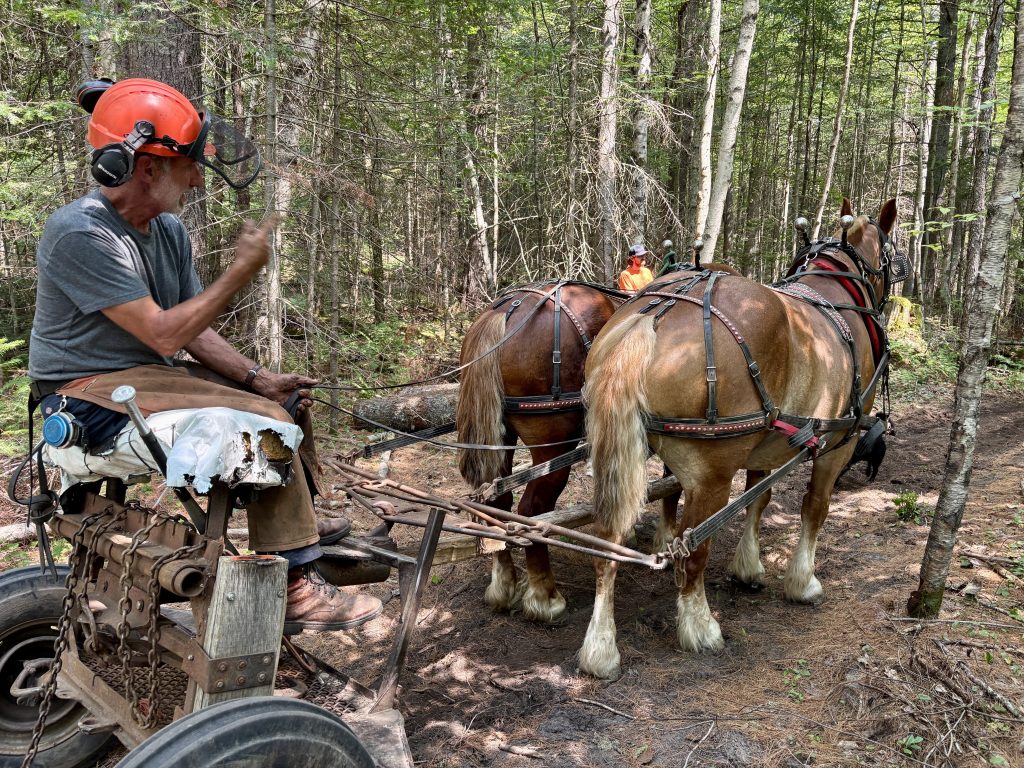 With some syrup samples stashed in our packs, we headed out to meet Jim, a horse logging legend, and yes, star of his own YouTube channel all about the lost art of horse-based logging and farming. Bill and Baron, his draft horses, were an impressive, voice-commanded pair, and I was lucky enough to get a chance to drive them a short distance while they pulled a log. Horse loggers, when available, are terrific at maneuvering through a stand with less residual impact than typical heavy equipment, so they are ideal for precise harvest operations like selective thinnings.