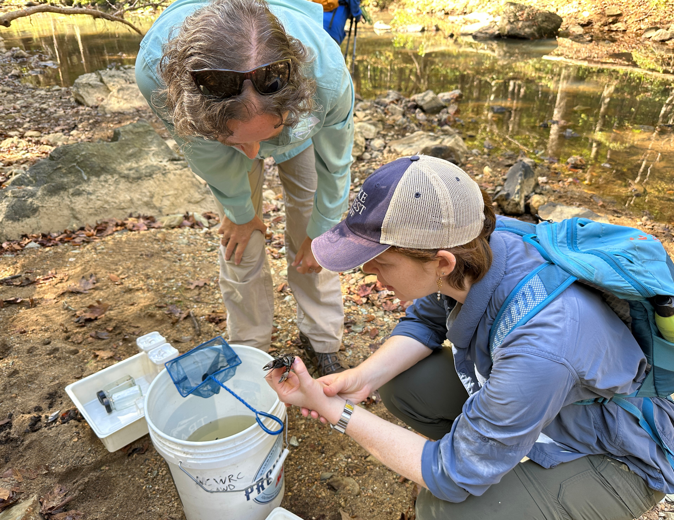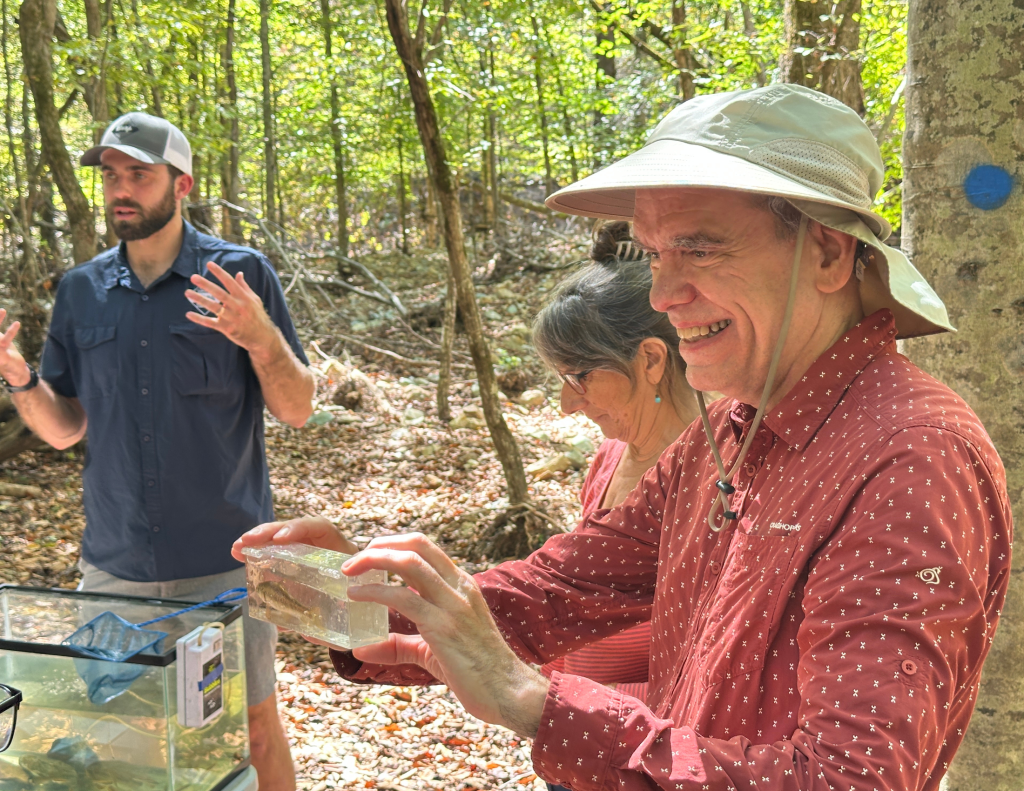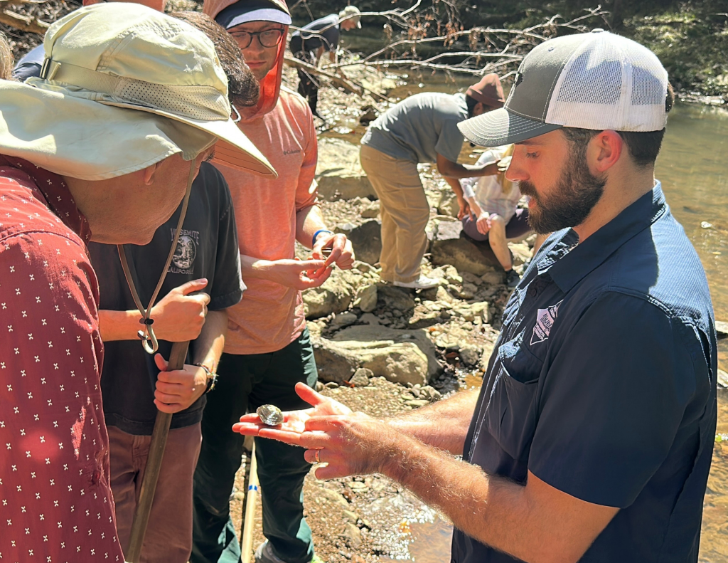 Presentations by North Carolina Wildlife Resources Commission Biologists Brena Jones and Langston Rimmer highlighted the aquatic diversity of New Hope Creek, particularly the mussel and fish species that call it home. They discussed the federally threatened Atlantic Pigtoe mussel (Fusconaia masoni) and its host species, the Creek Chub (Semotilus atromaculatus), both of which will benefit from the removal of the old Concrete Bridge as part of the restoration projects. Brena and Langston caught a variety of fish, crayfish, and mussels for attendees to see up close, and they encouraged folks to get their feet wet while exploring the creek as part of their demonstrations.